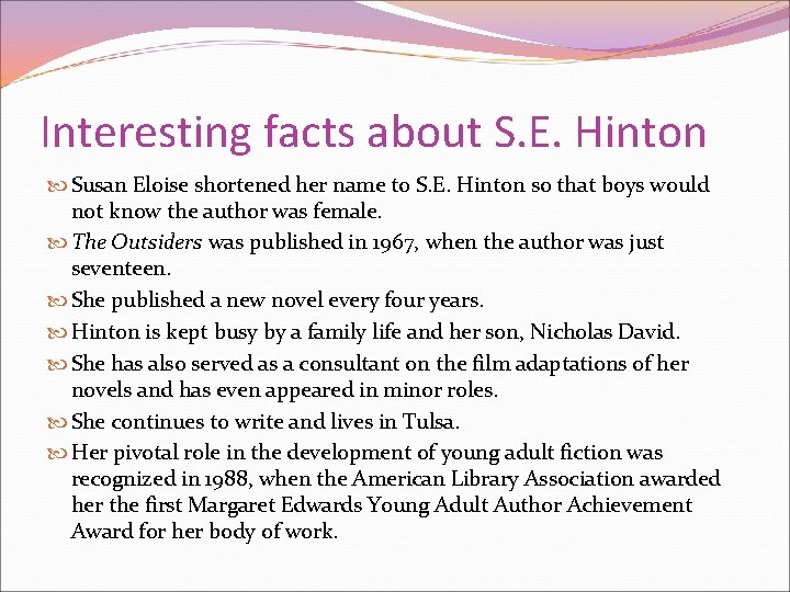 Her novels changed the way people look at young adult literature. Susan Eloise Hinton was born on the 22nd of July 1950 Fun Fact fam Facts about SE. Hinton Although she is a women many never knew because she never revealed her true name because she was afraid shed get turned down from publishers for being a girl By.