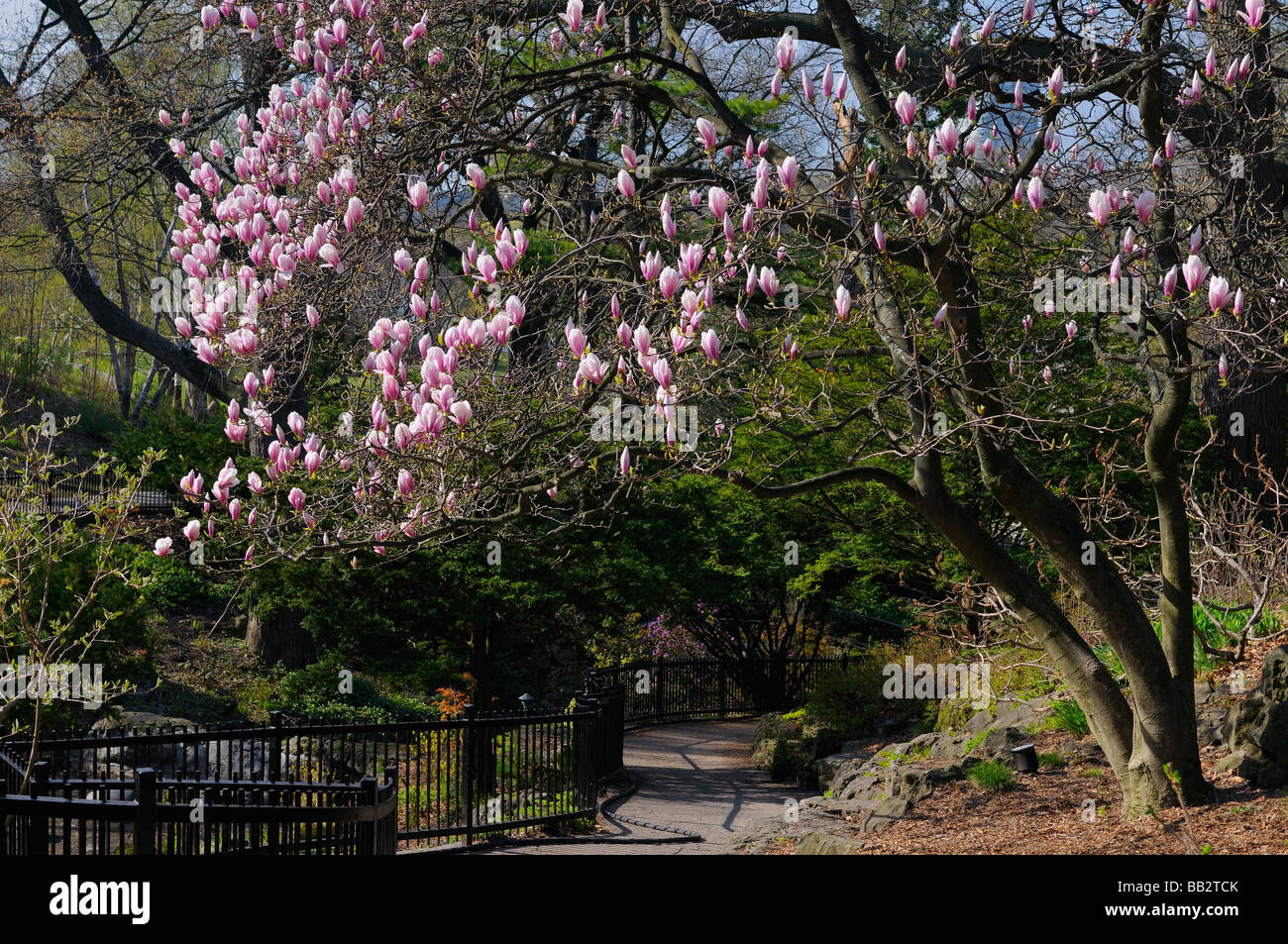 Pink blooms of a Saucer Magnolia soulangiana tree along a path in Stock